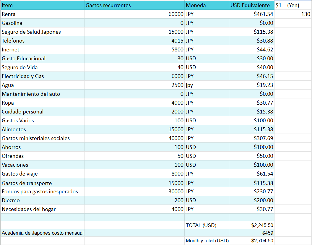 Salario: de las donaciones obtendré un salario con un valor justo el cual está por determinarse con Reaching Japan en los siguientes meses. Es posible que busque un trabajo que sea solo unas cuantas horas a la semana, en este caso mi salario como misionero se reducirá proporcionalmente según el número de horas tomadas por mi trabajo parcial en Japón. También se ha discutido la posibilidad de recibir ayuda de la iglesia como ser recibido en una casa, en ese caso no sería necesario pagar un arriendo y esto también reduciría mi salario de forma proporcional. Finalmente el pago de la Academia de Japones no saldrá de mi salario.